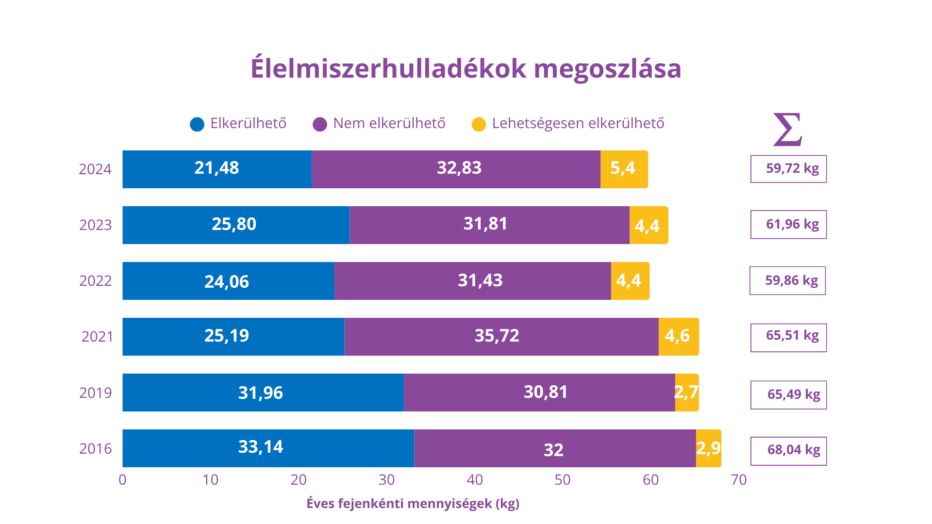A legfrissebb eredmények alapján fejenként átlagosan 59,7 kg élelmiszerhulladékot termelünk a háztartásunkban egy év során, amely a teljes lakosságra vetítve 570 ezer tonna. Az összes élelmiszerhulladéknak a több, mint 36%-a elkerülhető, vagyis a tiszta pazarlás. Ez alapján 21,5 kg élelmiszert pazarol átlagosan egy magyar ember háztartásában évente, amely a teljes lakosságra vetítve 205 ezer tonna pazarlást jelent.