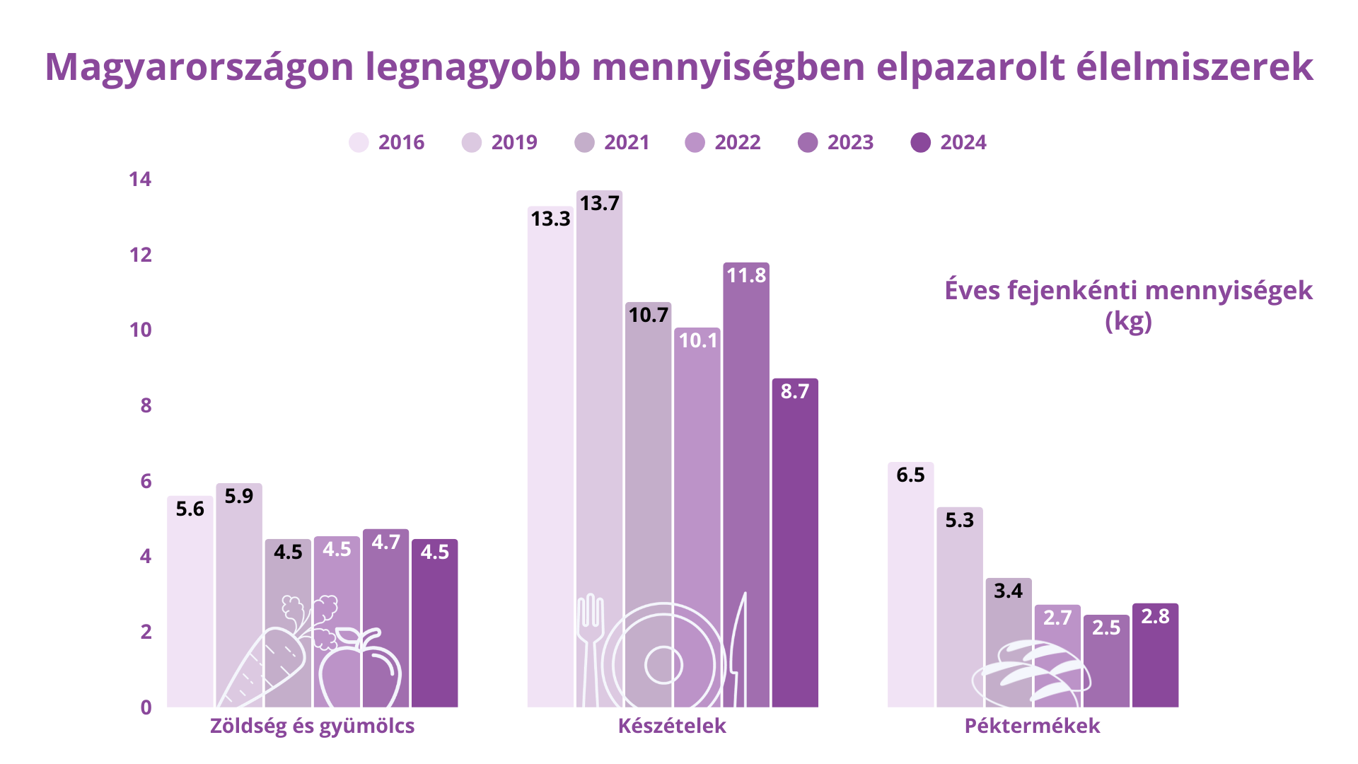 A leggyakrabban elpazarolt ételek listája évek óta nem változott, még mindig a készételek vezetik (8,72 kg/fő/év), ugyanakkor ez a 2023-as értékhez képest közel 3 kilóval csökkent. A lista második helyén a zöldségek és gyümölcsök szerepelnek fejenkénti 4,46 kg-os pazarlással és a 3. helyre 2024-ben is a pékáruk kerültek (2,76 kg-mal).